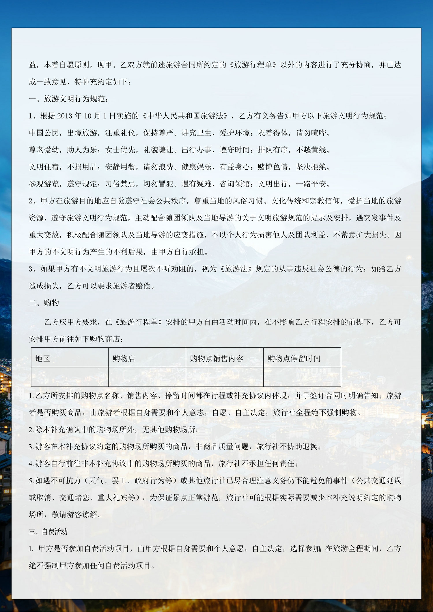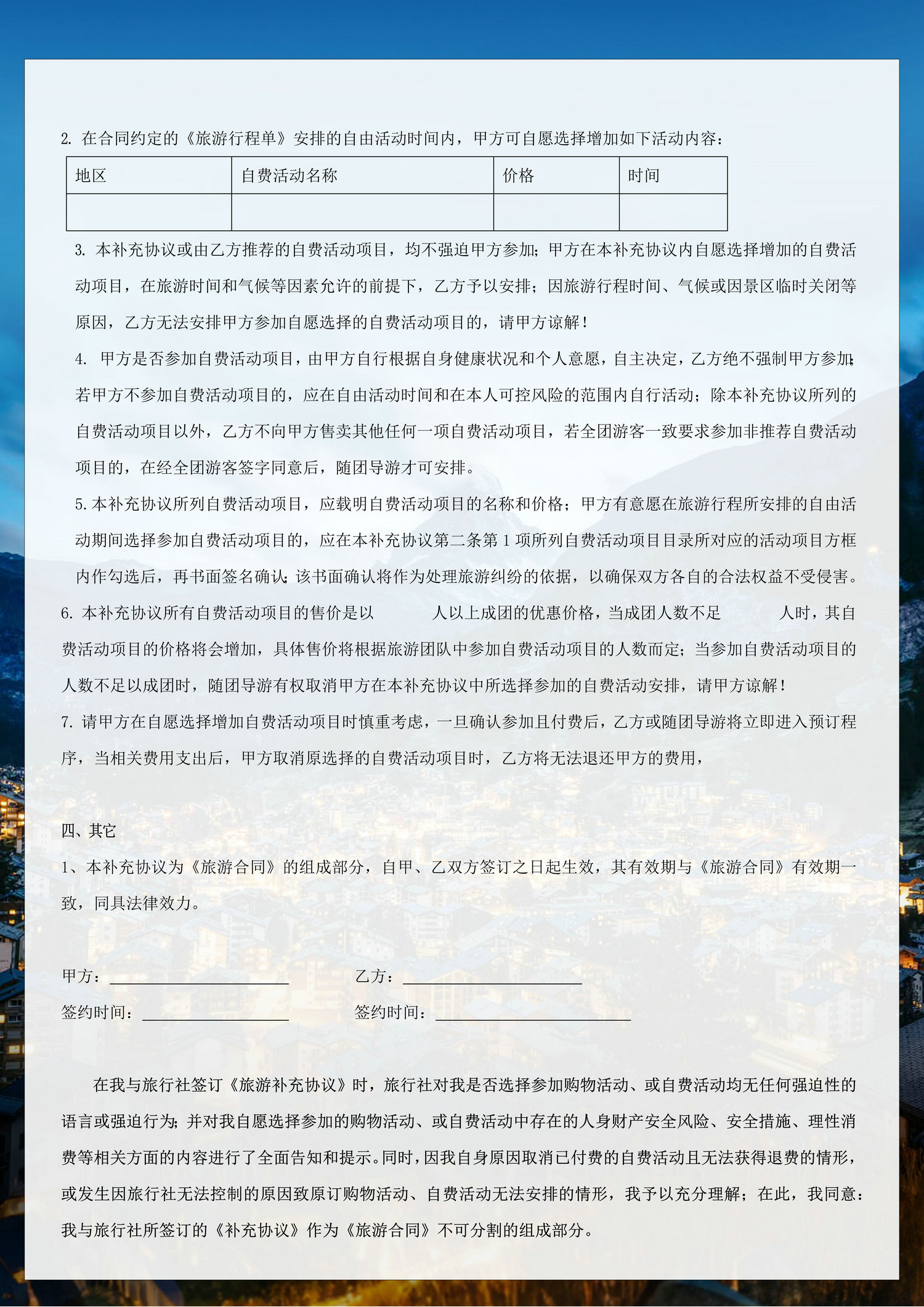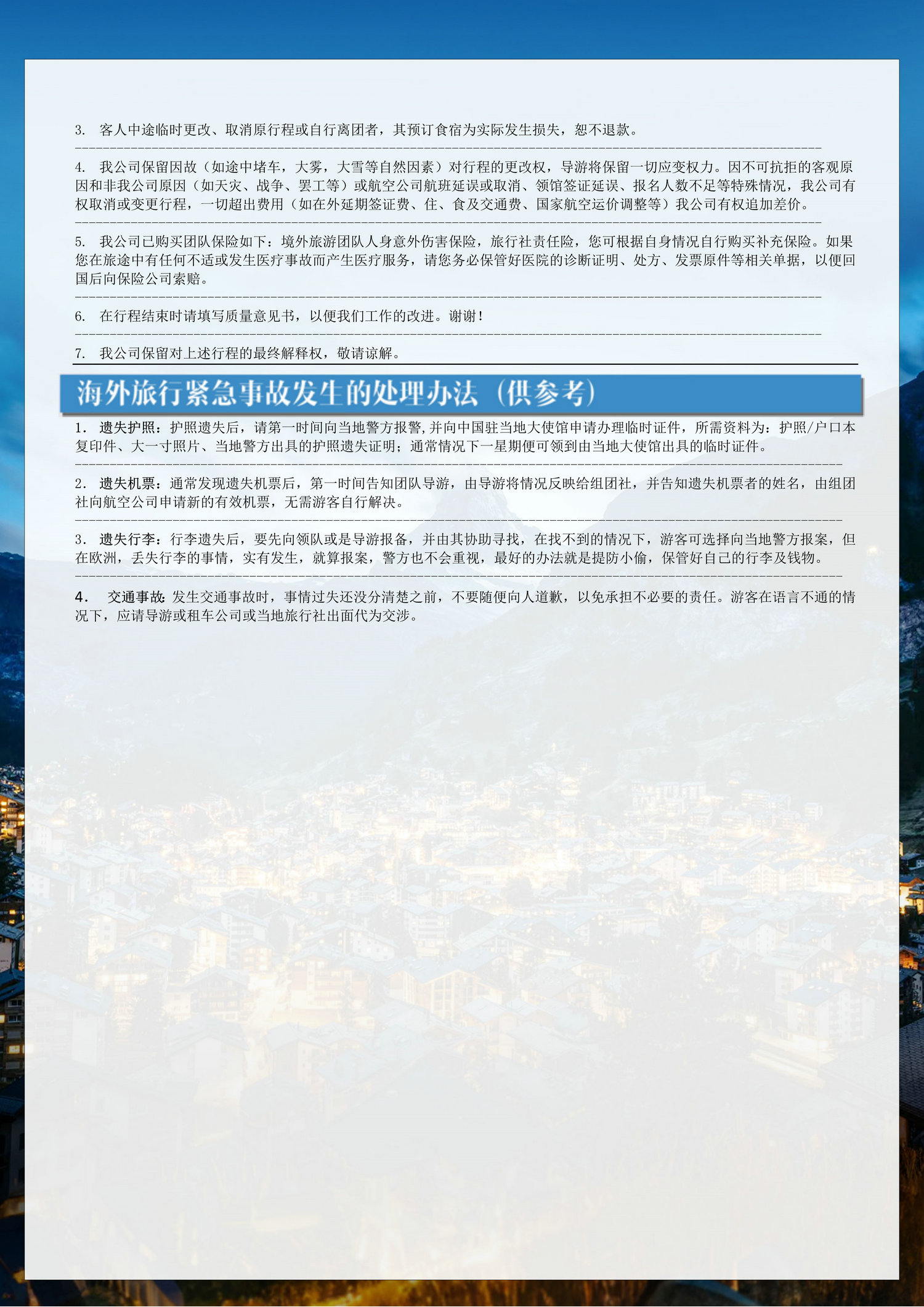 6、行程中未提及的其他费用,如特殊门票、游船(轮)、缆车、地铁票等费用;