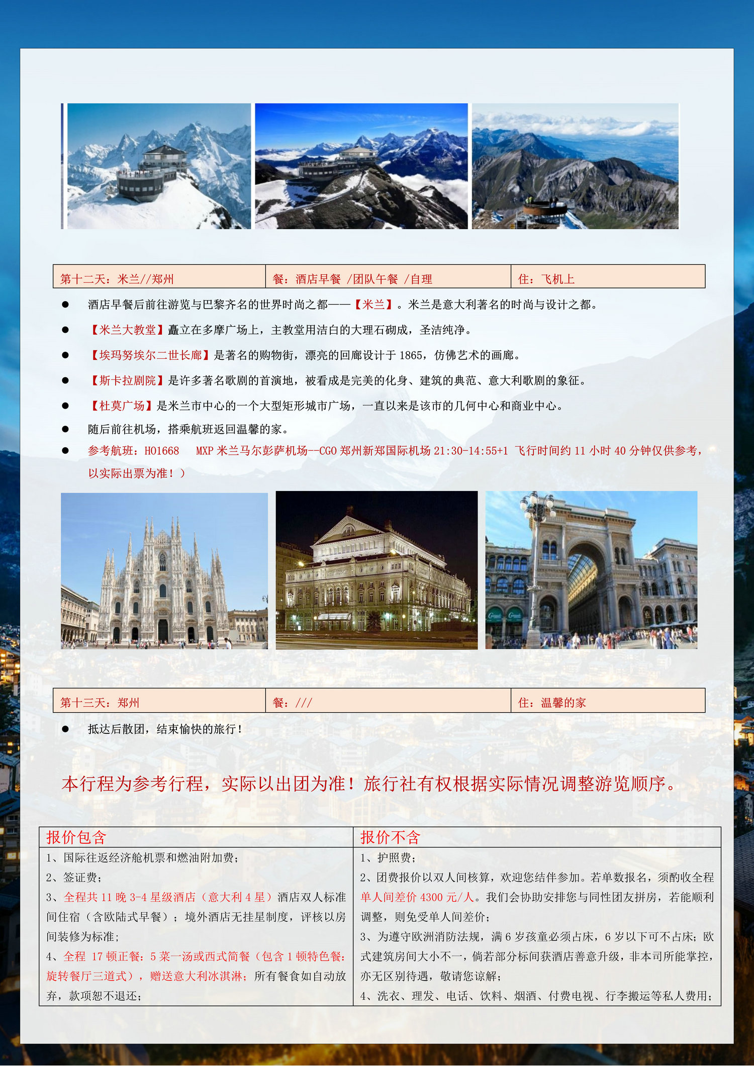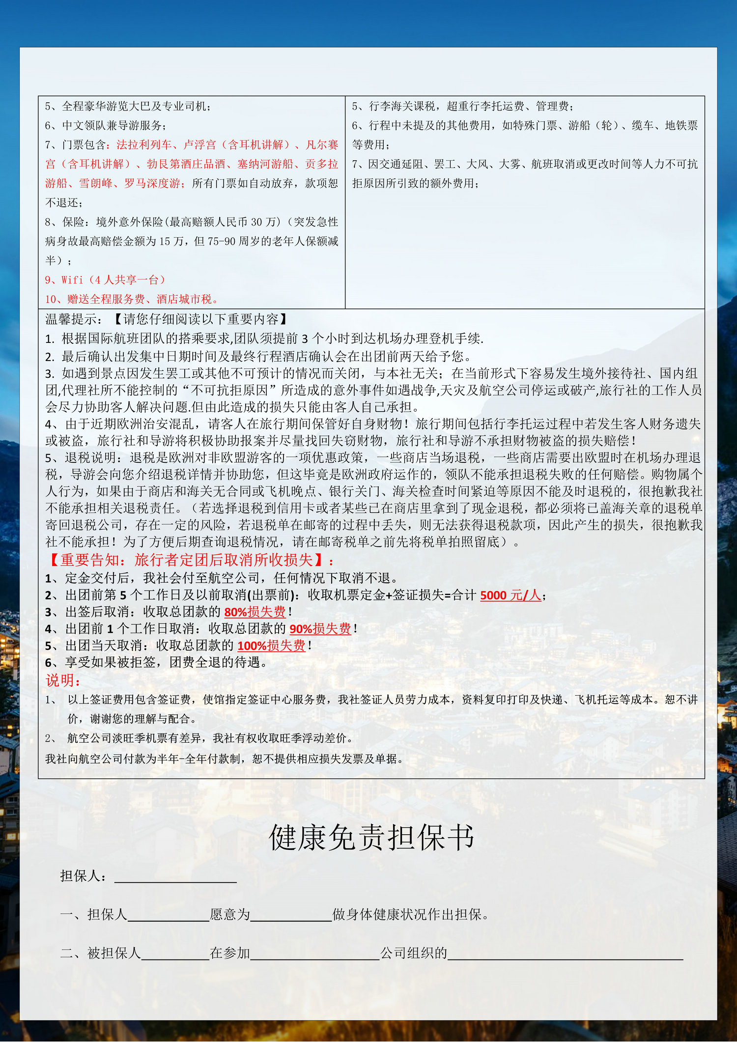 2、团费报价以双人间核算,欢迎您结伴参加。若单数报名,须酌收全程单人间差价4300元/人。我们会协助安排您与同性团友拼房,若能顺利调整,则免受单人间差价;