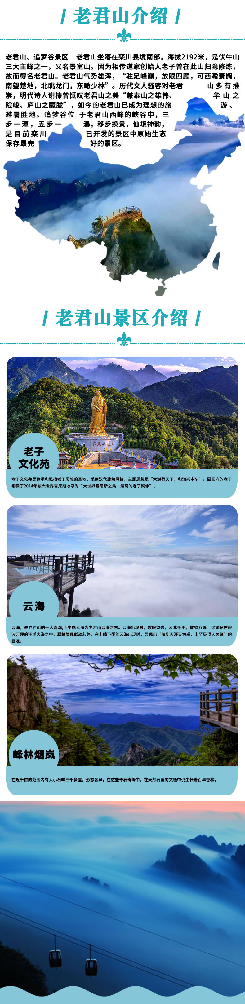 【景区简介】 老君山古名景室山,因道教始祖老子归隐修炼于此而更名。唐太宗李世民认老子为祖,颁御旨监修老君庙,封“铁顶”老君山为“天下名山”,与湖北武当山“金顶”南北呼应。八百里伏牛主峰老君山,海拔2200米,是国家级自然保护区,山水景点七十二处,其石林奇景被世界地质公园评审专家赵逊先生称是“迄今为止世界范围内发现规模最大的花岗岩峰林奇观”。