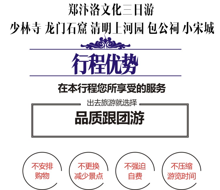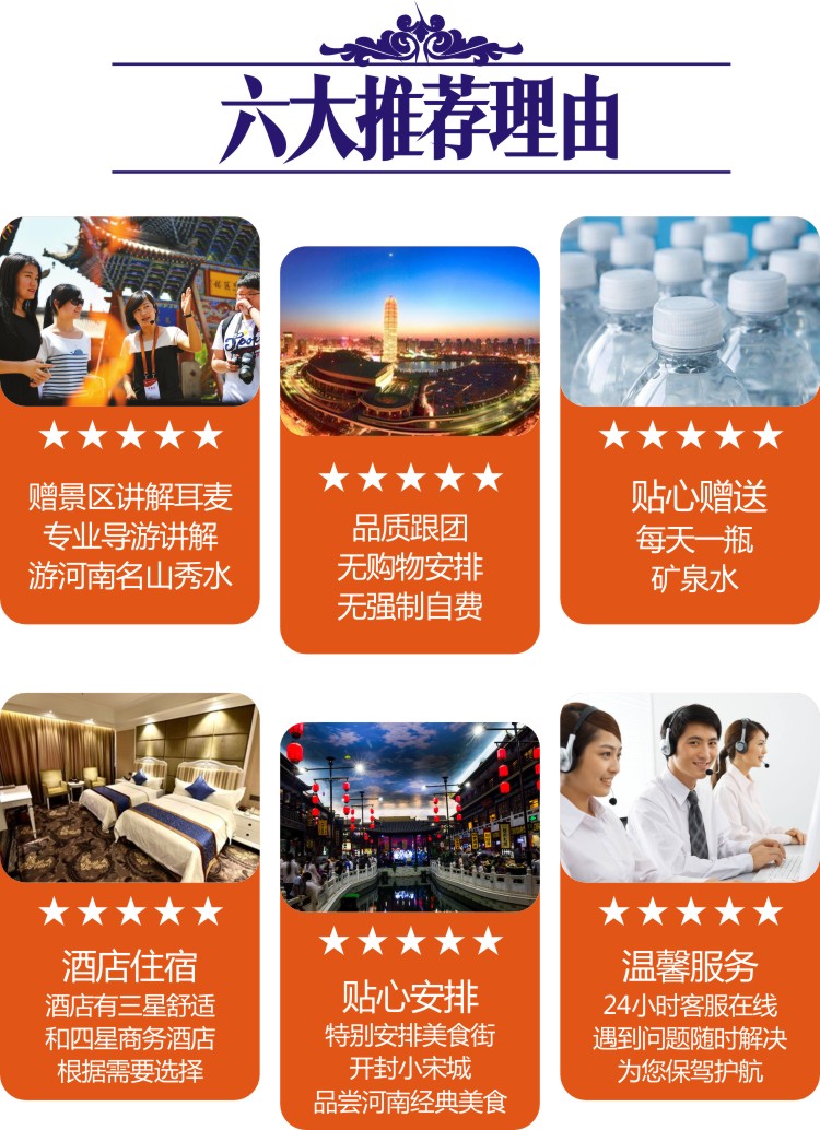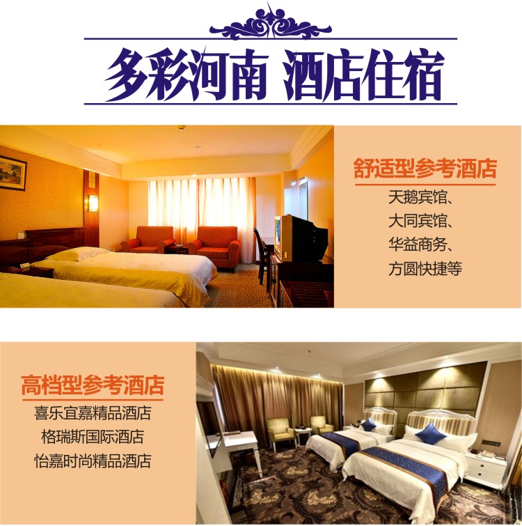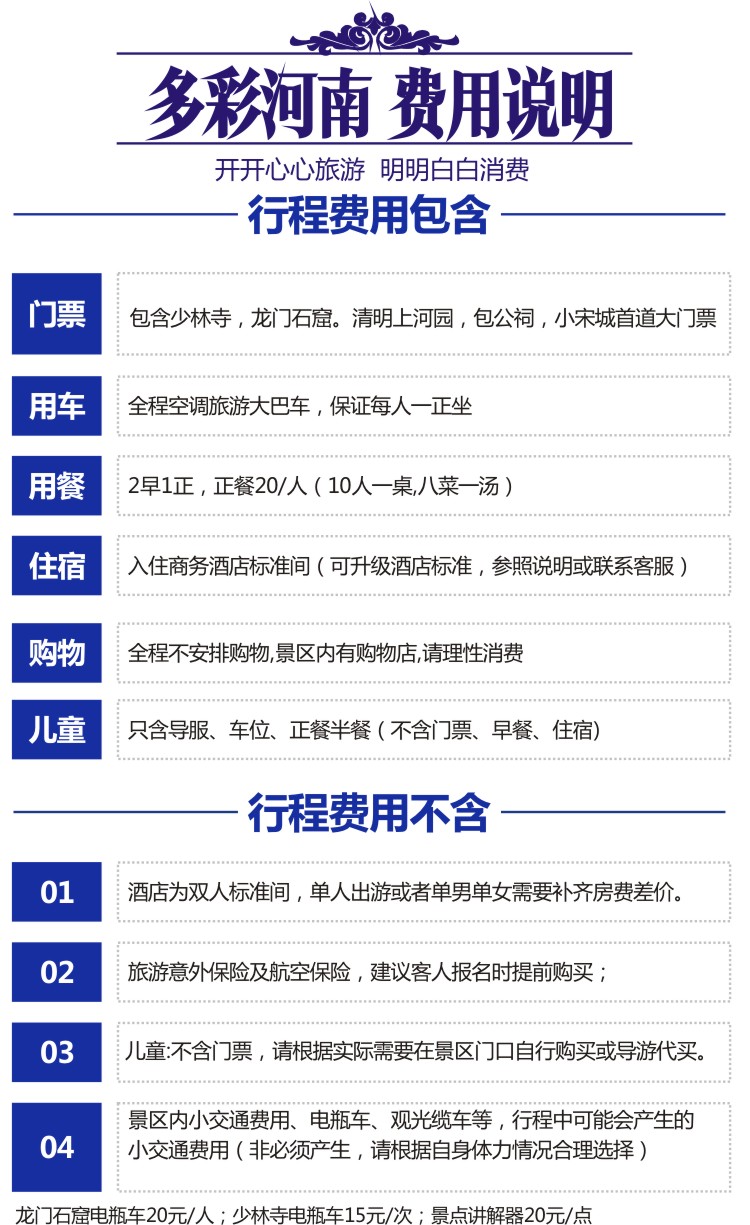 3、因散客拼团,游客抵达河南的时间不尽相同,有时需要等候团友集合,旅游车将停靠在郑州火车站 ,请客人保持通讯畅通,逾时请自行前往同团队汇合;最后一天晚上将在火车站、地铁或机场大巴站结束行程,请合理安排行程和交通。